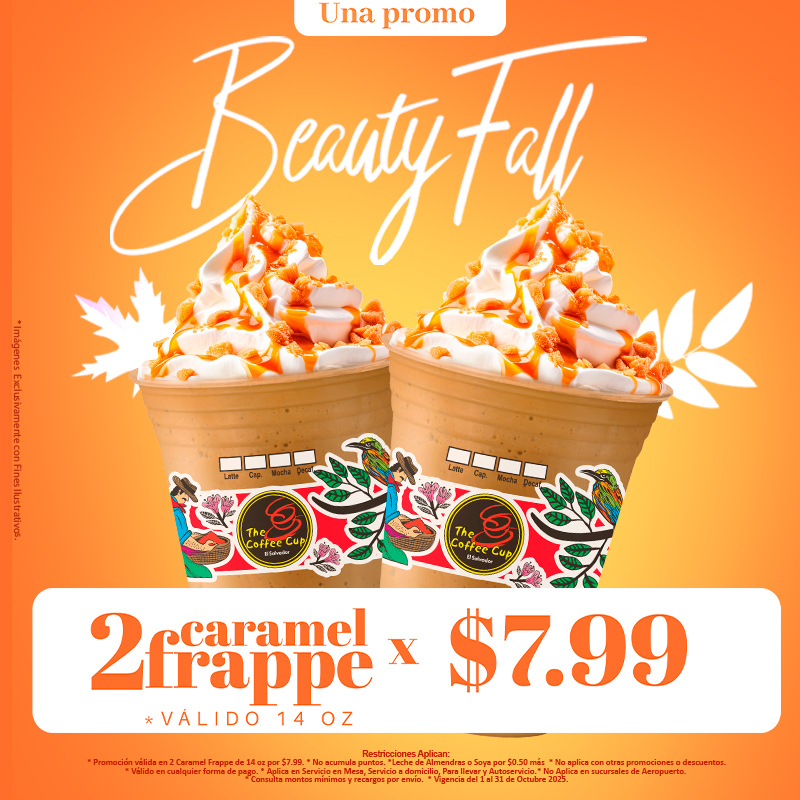 En octubre se disfruta mejor con sabor a caramelo. Llévate 2 Caramel Frappe (14oz) por solo $7.99 y comparte la dulzura de la temporada. ¡Disponible todo octubre en The Coffee Cup!